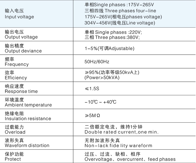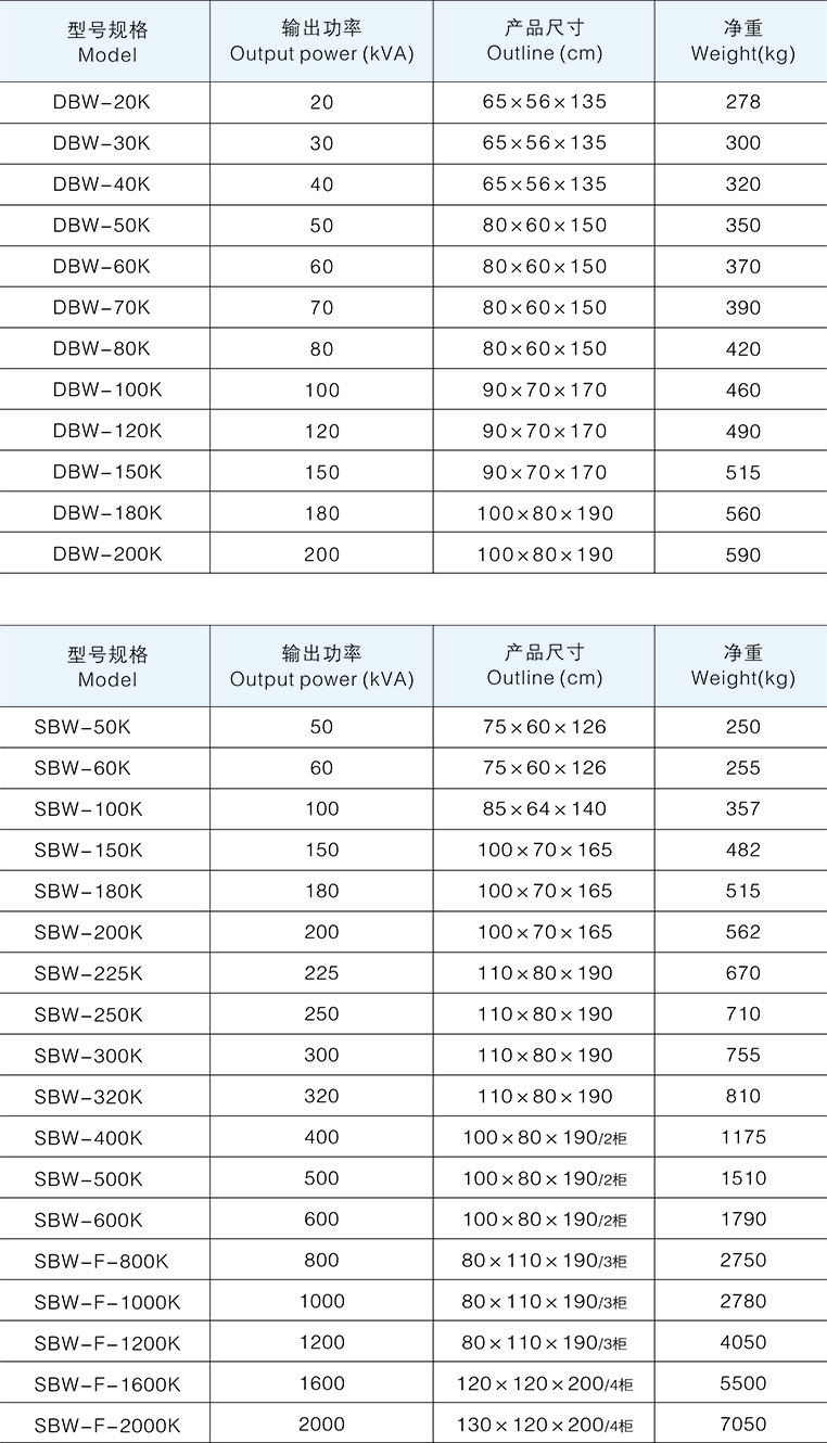 SBW、DBW系列单、三相全自动补偿式电力稳压器是适用于当外界的供电网络电压波动或负载变化而造成电压波动时,能自动保持输出电压稳定。本系列产品与其它型式的稳压器相比,具有容量大、效率高、无波形畸变、电压调节平稳等优点,适用负载广泛,能承受瞬时超载,可长期连续工作,手动 /  自动切换,设有过压保护、缺相、相序保护及机械故障自动保护,本机体积小,重量轻,使用安装方便,运行可靠等优点。(分数显、仪表指示两类)。