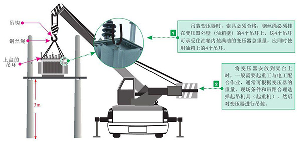 配电变压器需要安装在电杆的架台上,安装时,通常需要借助起重机将其吊起,安放在架台上,并进行固定。