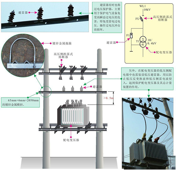 避雷器是配电变压器中必不可少的防雷装置,一般高压侧避雷器应安装在高压熔断器与变压器之间,通常安装在一根63mm×6mm×2050mm的镀锌金属横担上。