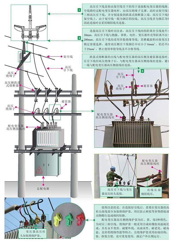 避雷器之间接线完成后,接下来需要按供电关系,将高压引下线与跌落式熔断器、避雷器、配电变压器及总配电箱连接。图为配电变压器与相关设备的接线。
