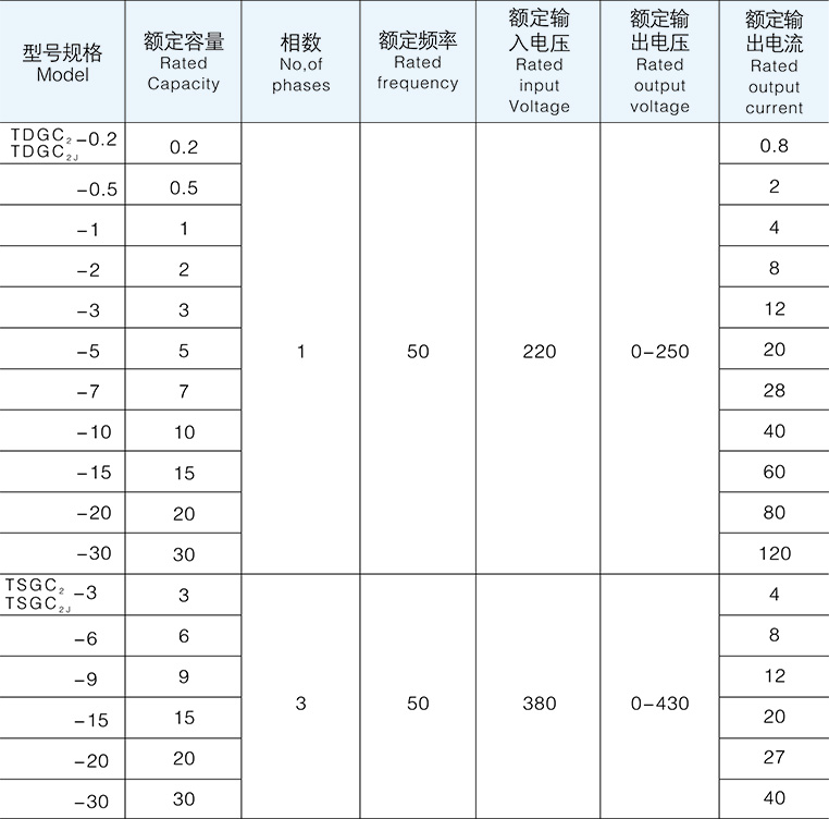 TDGC2、TSGC2、TDGC2J、TSGC2J系列调压器具有波形不失真、体积小、重量轻、效率 高、使用方便、性能可靠、能长期运行等特点、达到调压、控温、调光、功率控制等目的。 广泛应于化工、冶金、仪器仪表、机电制造、轻工业、科学实验、公用设施、家用电器、控温调整、 调光、及功率控制等目的,是种理想的交流调压电源。